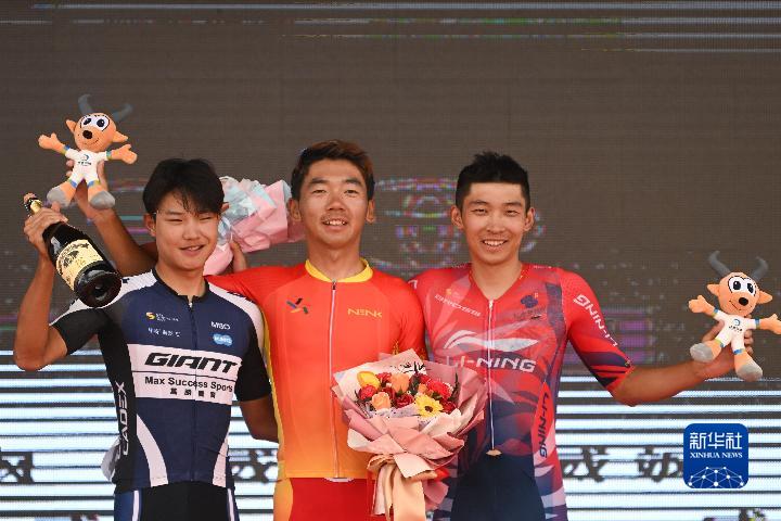 7月31日,獲得當(dāng)日賽段前三的甘肅體彩隊(duì)選手彭鑫(中)、捷安特洲際隊(duì)選手吳俊杰(左)、李寧之星洲際隊(duì)選手牛益逵在領(lǐng)獎臺上合影。新華社記者 張龍 攝
