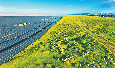 青海省海南藏族自治州,綿延數(shù)百平方公里的塔拉灘生態(tài)光伏發(fā)電園區(qū)里,深藍色的“光伏海洋”蔚為壯觀,光伏板下牧草茂盛,綠意盎然。