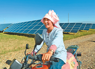 落日余暉中,牧民索南卓瑪騎著一輛摩托車,沿著歸家的方向,緩緩跟在羊群后面。“自從裝了光伏板,生態(tài)治理同步發(fā)力,一些戈壁灘變成了綠地,我們的生活也越來越好了。”對眼前土地發(fā)生的變化,生于斯長于斯的索南卓瑪深有感觸。
