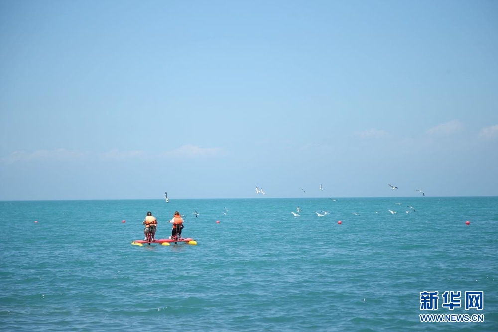 8月8日,游客在青海湖體驗(yàn)水上娛樂項(xiàng)目。新華網(wǎng) 馬洪婷 攝