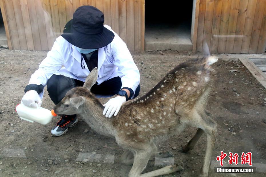 在祁連山國家公園青海片區(qū)野生動物救護繁育中心內(nèi),工作人員正在給馬鹿喂奶。新華網(wǎng) 卡婭梅朵 攝
