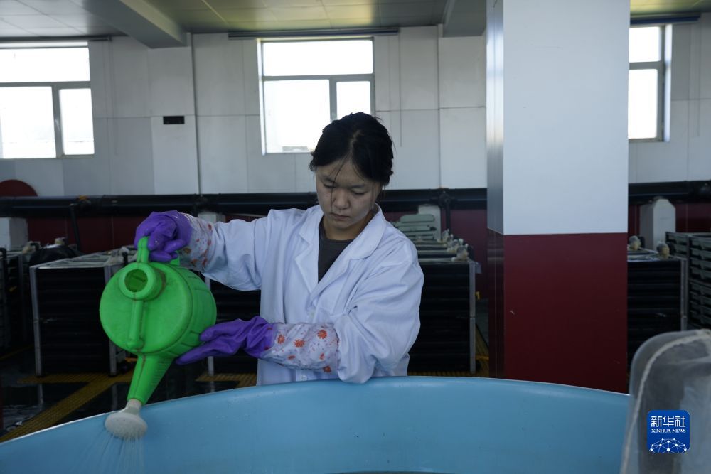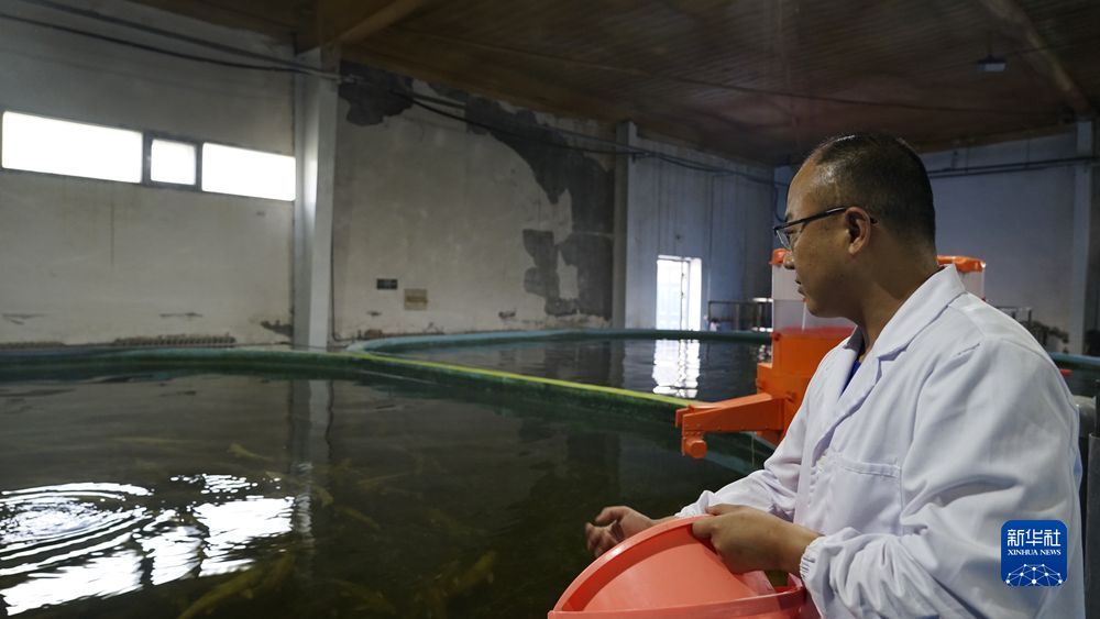 8月8日,青海湖裸鯉救護(hù)中心的工作人員為繁育車間里的湟魚喂食。新華社記者 陳杰 攝