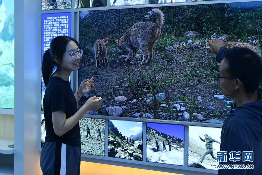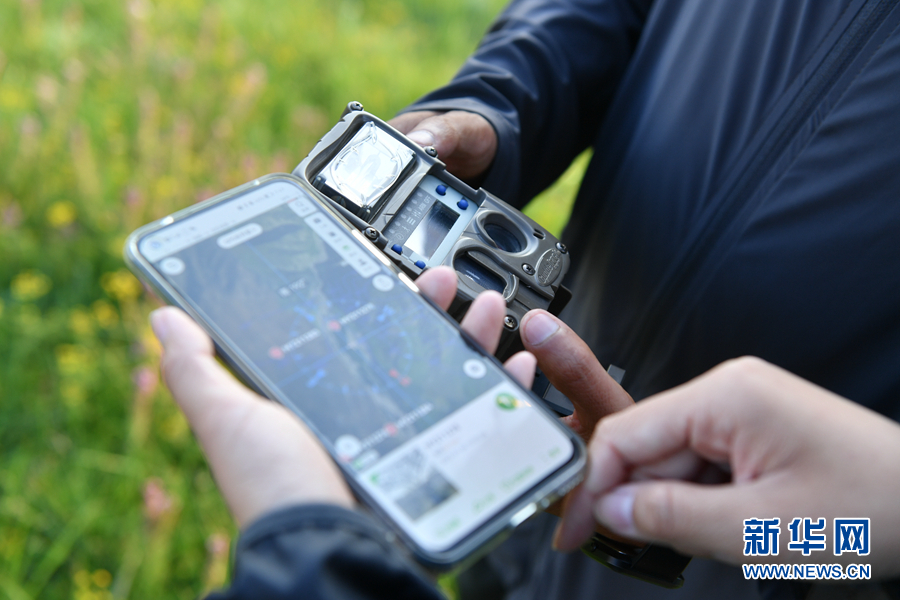 孔玥嶠和生態(tài)管護員正在查看野外布設的紅外相機的相關數(shù)據(jù)。新華網(wǎng) 卡婭梅朵 攝