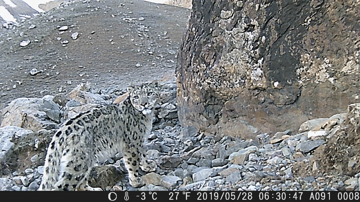 “我時常覺得,與其說是我們觀察雪豹,不如說是雪豹在觀察我們,它觀察我們,比我們觀察它要容易得多?!睋?jù)王大軍講述,有一次,團隊追蹤到一只雪豹的身影停留在山間,但遠遠望去,只有一條尾巴露在外面。通過攝影設備拉近畫面,才發(fā)現(xiàn)原來那只雪豹的雙眼也正在透過巖石的縫隙,觀察著他們。