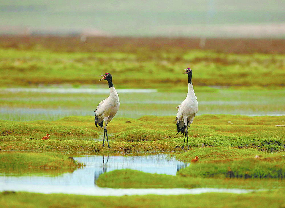 祁連山國(guó)家公園里黑頸鶴一家的幸福生活