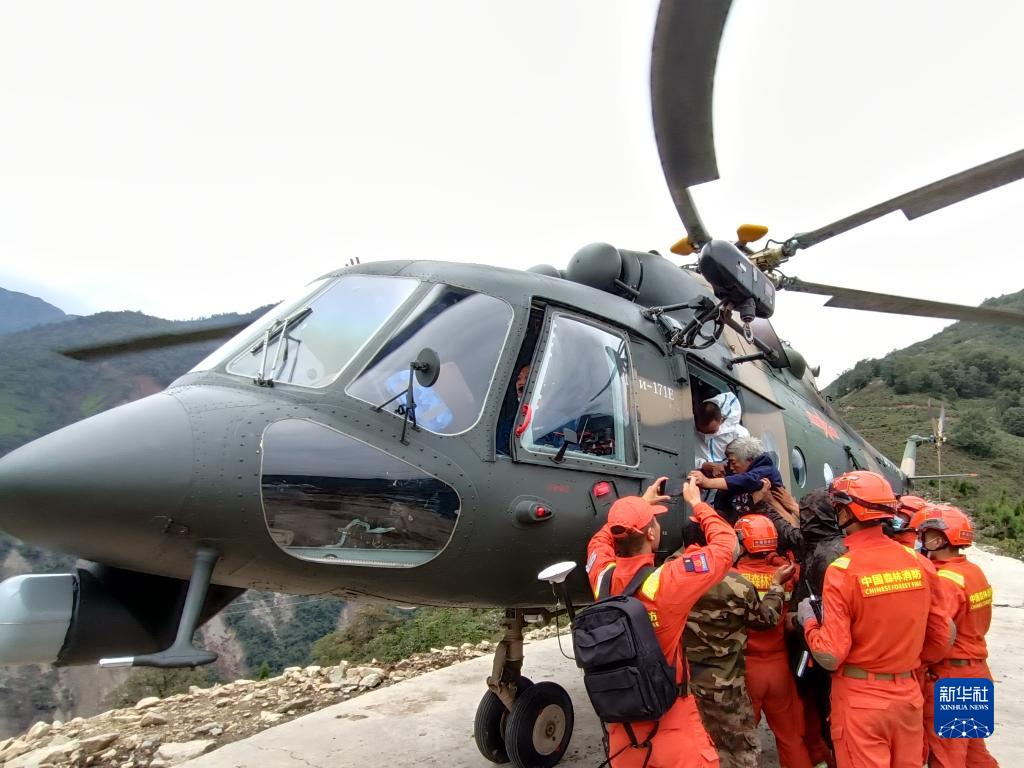 9月6日,西部戰(zhàn)區(qū)空軍某部緊急出動直升機在瀘定縣轉(zhuǎn)移群眾。新華社發(fā)(胡建軍 攝)