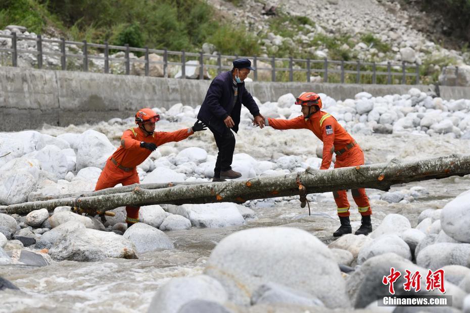 9月6日,四川甘孜州瀘定縣磨西鎮(zhèn),甘孜州森林消防支隊(duì)康定中隊(duì)隊(duì)員在木橋旁護(hù)送村民。 中新社記者 張浪 攝