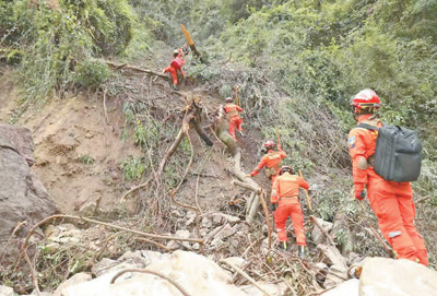 9月6日,因道路損毀嚴(yán)重,四川省森林消防總隊(duì)特勤大隊(duì)二中隊(duì)隊(duì)員徒步前往瀘定縣磨西鎮(zhèn)燕子溝深處的大烏科村,搜尋被困群眾。宋豪新 曾鵬 攝