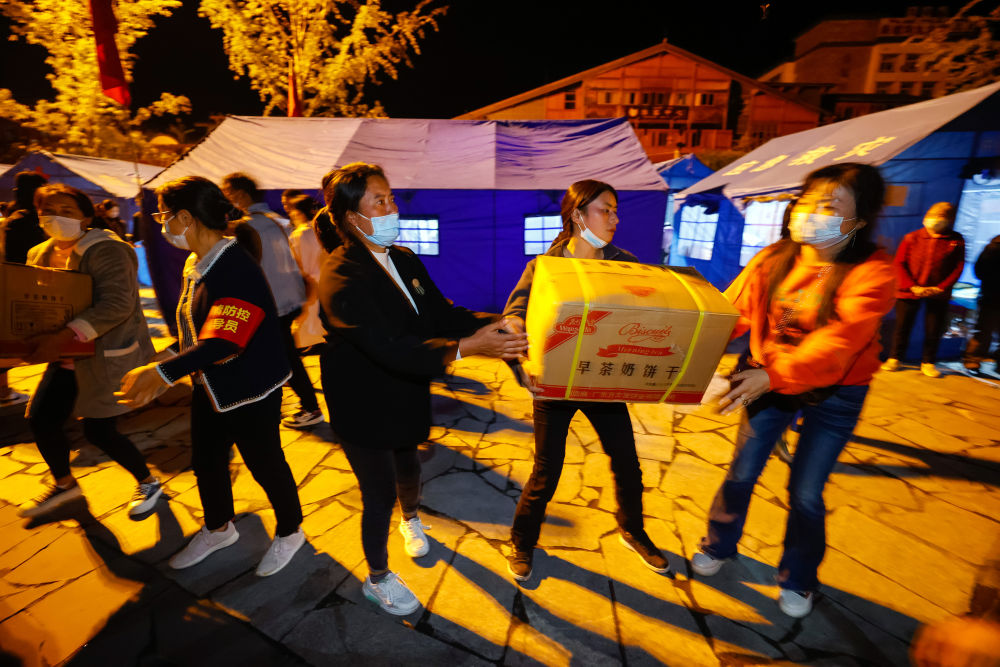 9月5日晚,在磨西鎮(zhèn)的受災(zāi)群眾臨時(shí)安置點(diǎn),人們?cè)趥鬟f救災(zāi)物資。