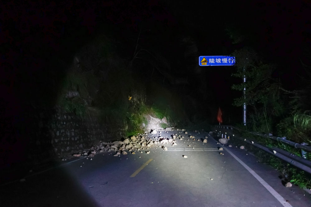 9月6日凌晨,通往得妥鎮(zhèn)的公路上,隨處可見(jiàn)震山體塌方后落下的碎石。