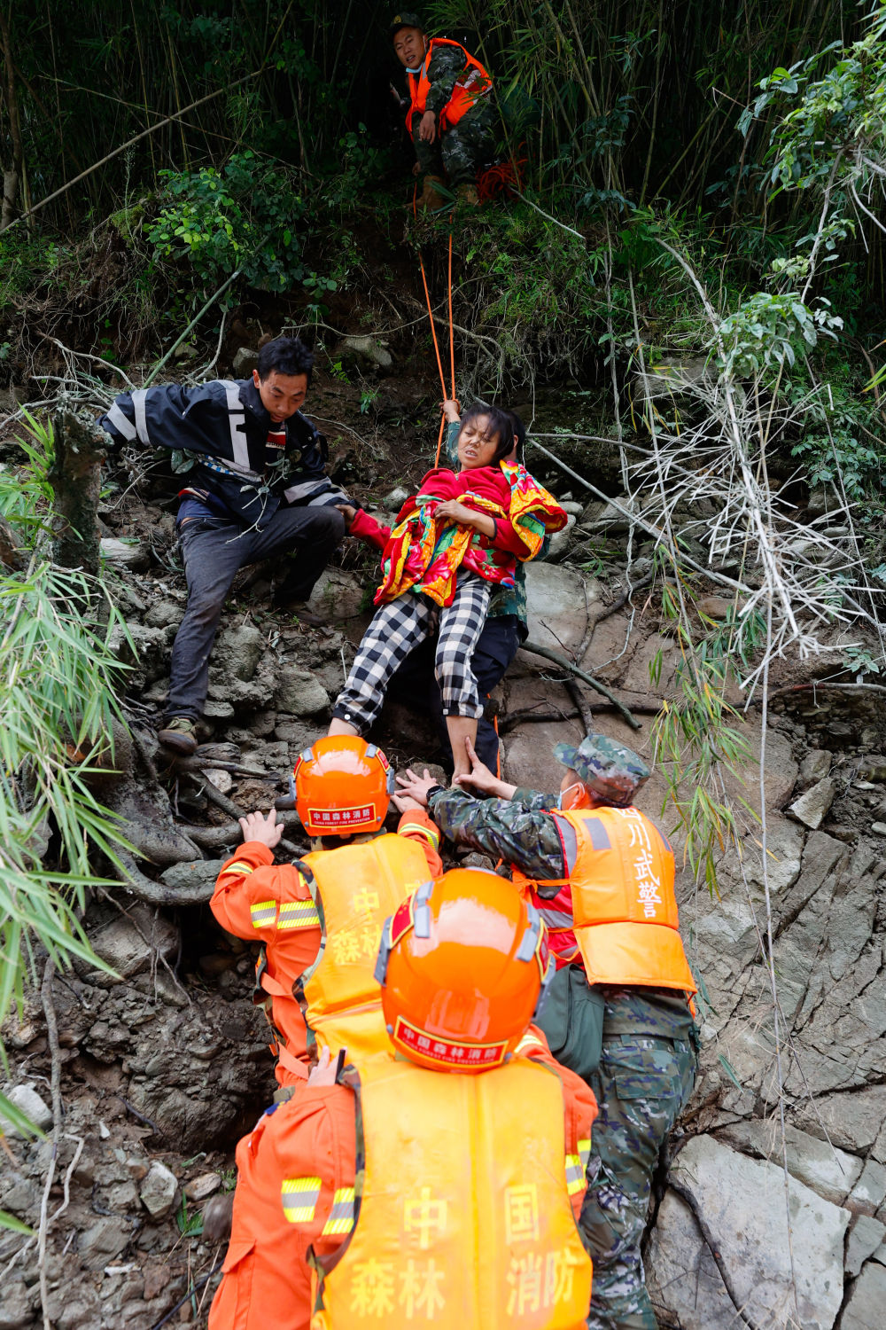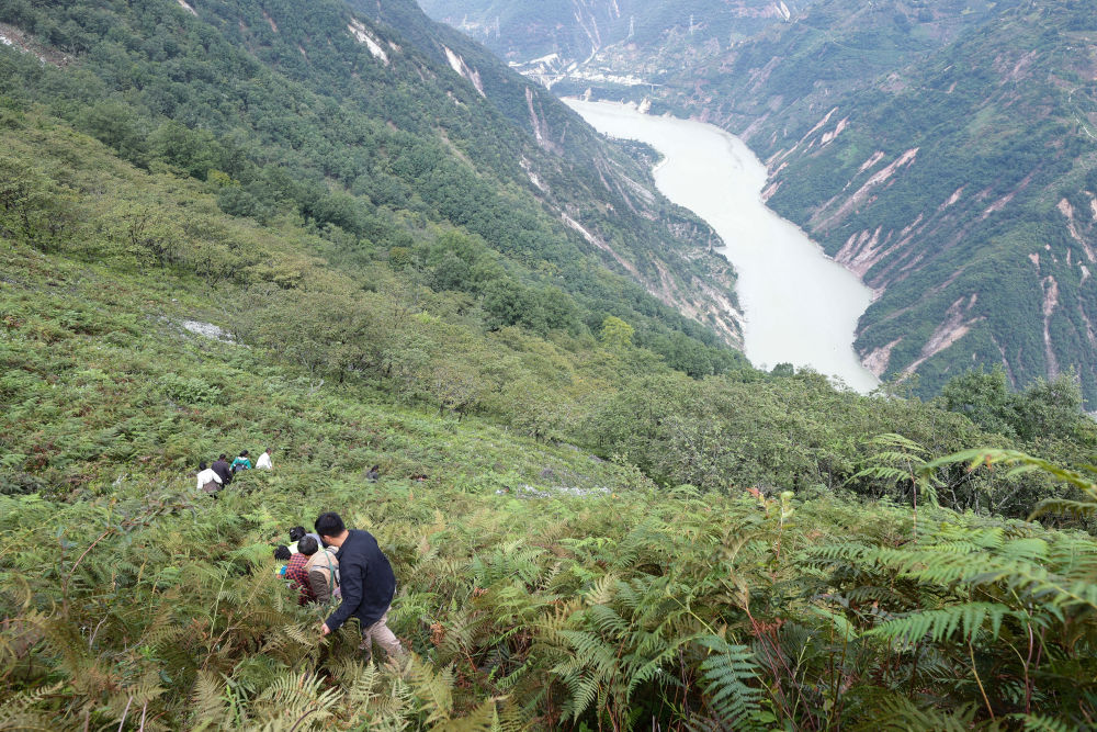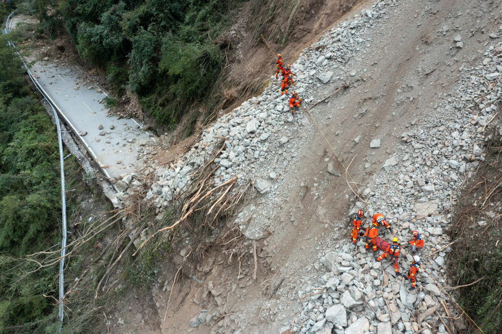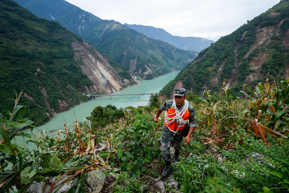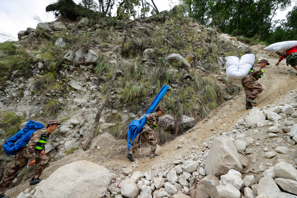 9月6日,救援人員攀爬高山,向?yàn)硸|村挺進(jìn)。