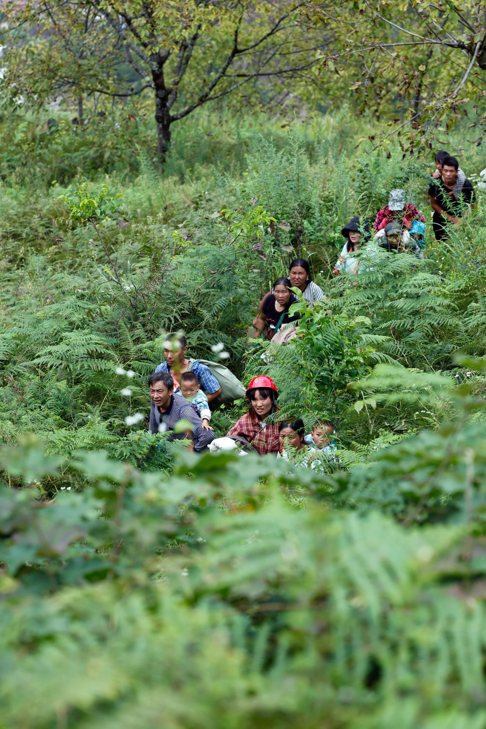 穿越了十余個(gè)這樣的路段,遠(yuǎn)遠(yuǎn)看到山下有人影晃動(dòng)在齊人高的綠色植物之間,再往山上走。向?qū)дf(shuō)他們是從灣東村一組上來(lái)的被困群眾。透過(guò)長(zhǎng)焦鏡頭看到,一名精壯的小伙子赤裸上身,拿著鐮刀走在最前面為鄉(xiāng)親們開(kāi)路,鄉(xiāng)親們跟在后頭,有的還背著孩子。幾名救援人員在變形的公路護(hù)欄旁接爬上來(lái)的人,一名背著孩子的婦女一握到解放軍戰(zhàn)士的手就哭了出來(lái)……待這批村民全部上到公路上后,救援人員護(hù)送他們返回紅花崗附近可以停直升機(jī)的疏散地點(diǎn),然后再去山下接人。