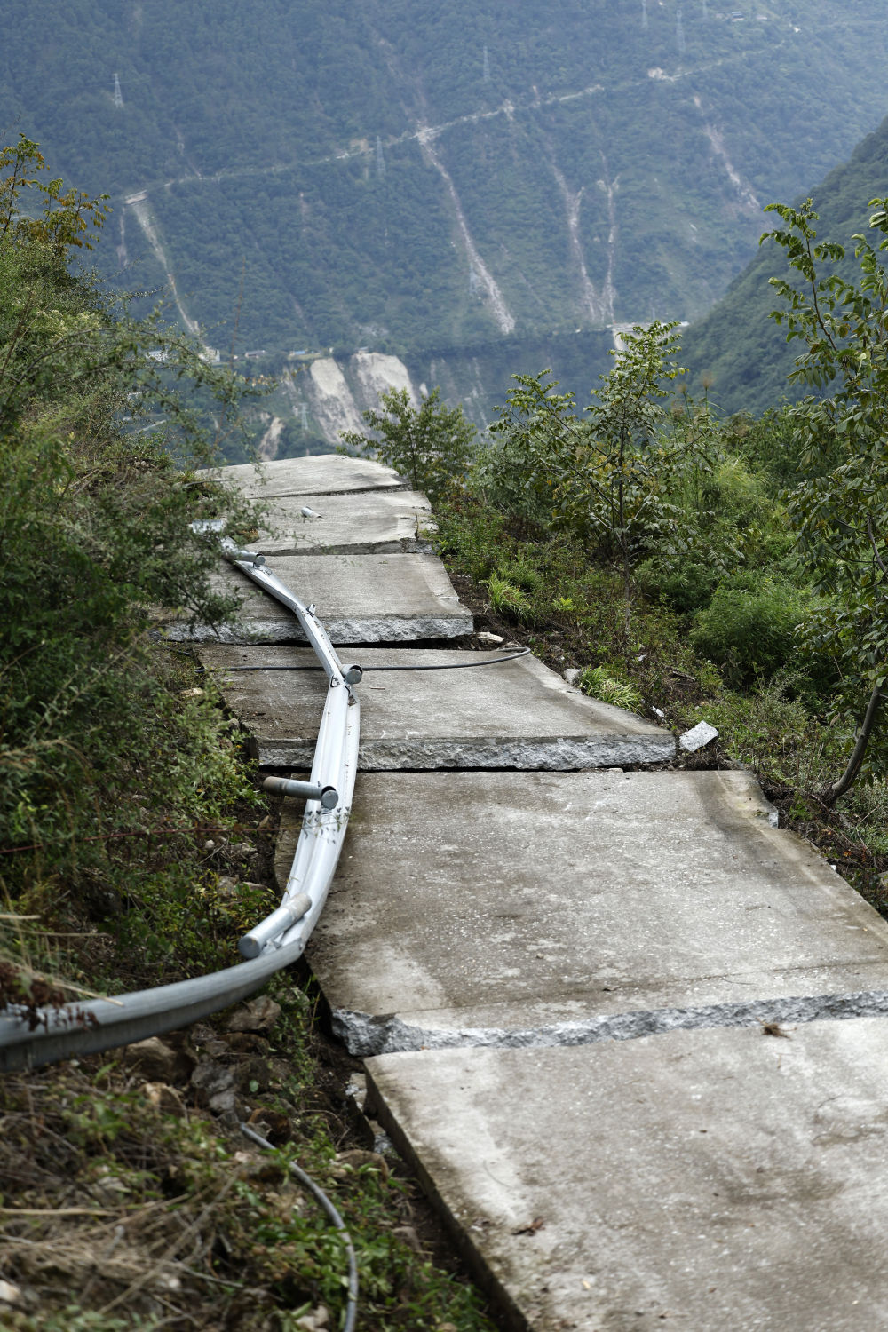 得知我們要去共和村,村干部叫來(lái)三輛摩托車(chē),給車(chē)加了點(diǎn)汽油,送我們上去。上山的路本是只能容一輛汽車(chē)通過(guò)的水泥硬化路,經(jīng)過(guò)地震,沿途路面或裂開(kāi)、或傾斜、或拱起、或塌陷,滑落的巨石和被撕扯下來(lái)的樹(shù)木把小路擋得只容摩托車(chē)通過(guò),另一側(cè)就是深深的山溝。