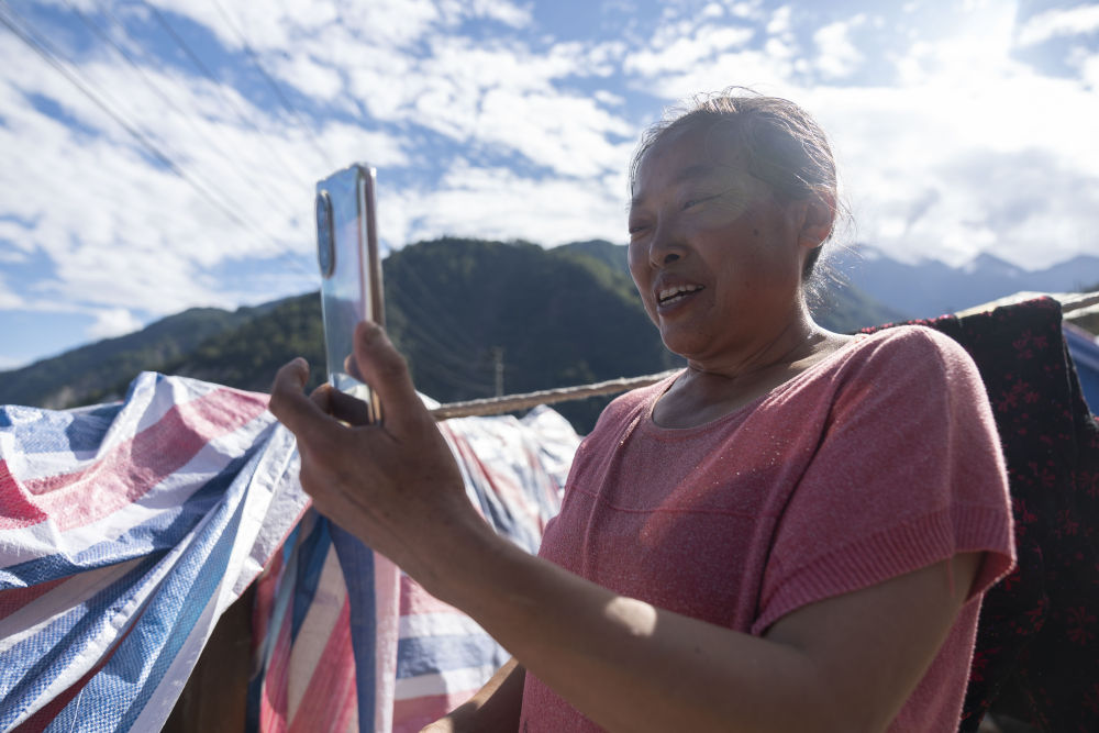 9月10日,在幸福村,技術(shù)人員安裝衛(wèi)星便攜站后,村民在與家人用手機(jī)進(jìn)行視頻通話(huà)。