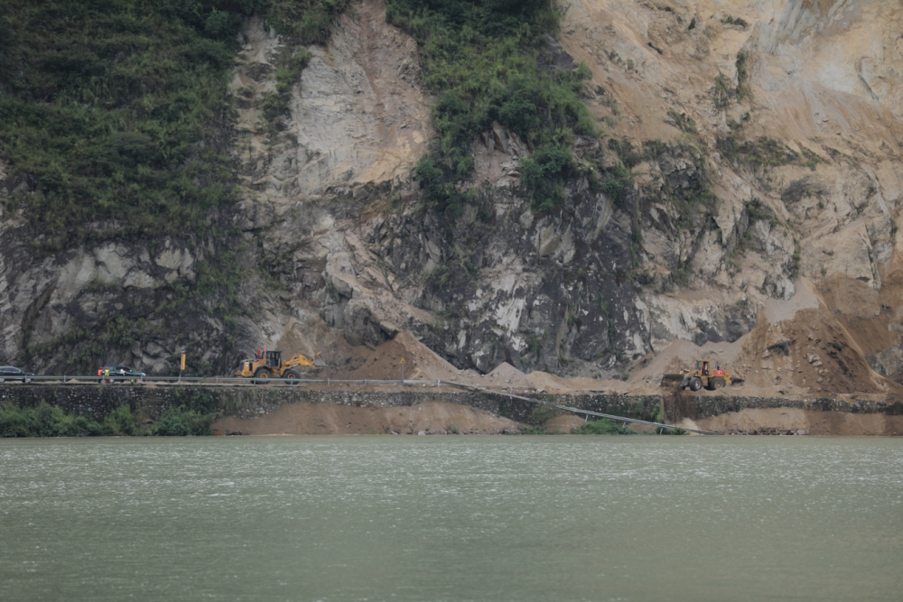 時(shí)間已經(jīng)到了下午3點(diǎn)半,我決定跟著十余個(gè)村民走下山,盡快下山整理照片發(fā)稿。下山路比上山路略好走一些,有時(shí)沿著尚未中斷的山間盤(pán)山公路行走,有時(shí)會(huì)經(jīng)過(guò)之前村民踩出的小路,有時(shí)只能自己開(kāi)路向前。兩個(gè)來(lái)小時(shí)之后,坐在返回得妥鎮(zhèn)的橡皮艇上,我懸著的心才終于落下。
