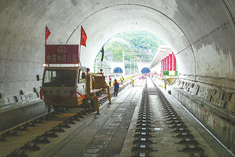 躍龍門隧道鋪軌現(xiàn)場(chǎng)。 成蘭鐵路公司供圖
