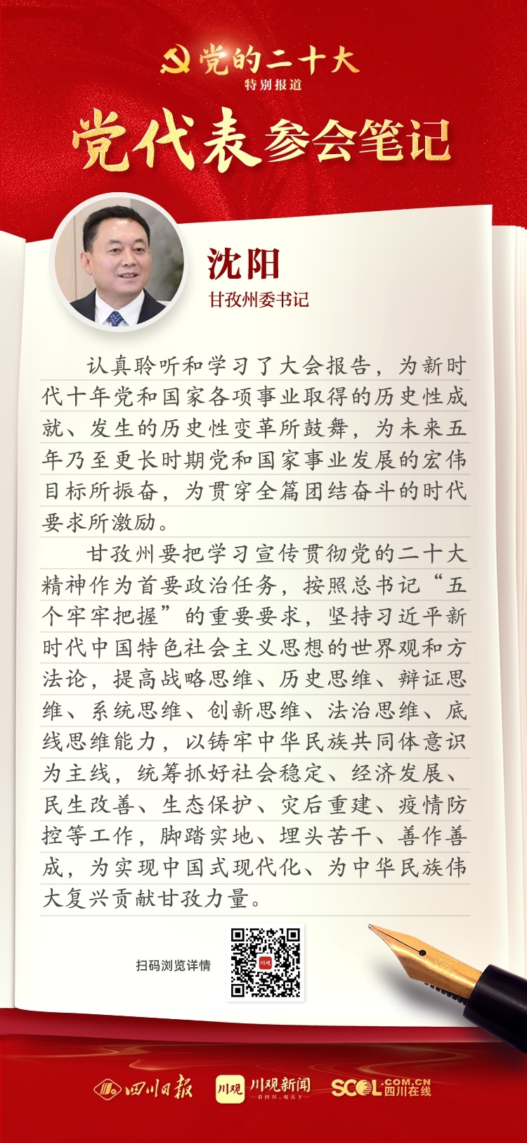 出席盛會,來自四川的黨代表深感使命光榮、責任重大,大家認真履職,結合報告談認識、談體會、談打算。川觀新聞特此推出“黨代表參會筆記”欄目,分享黨代表們的參會心得,敬請垂注。