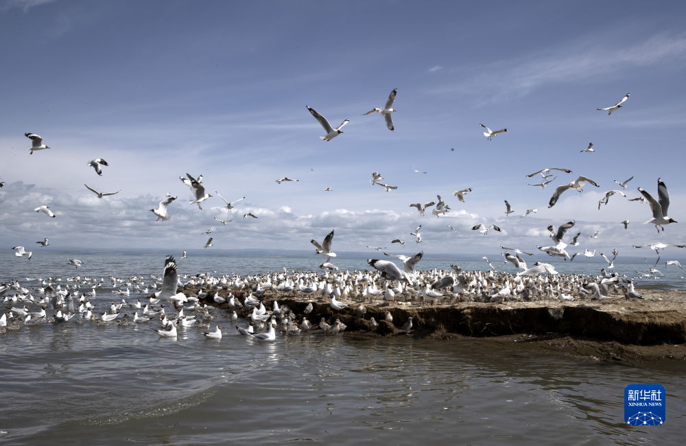 一群水鳥在青海湖鳥島濕地活動(dòng)(2021年7月1日攝)。新華社 星智 攝