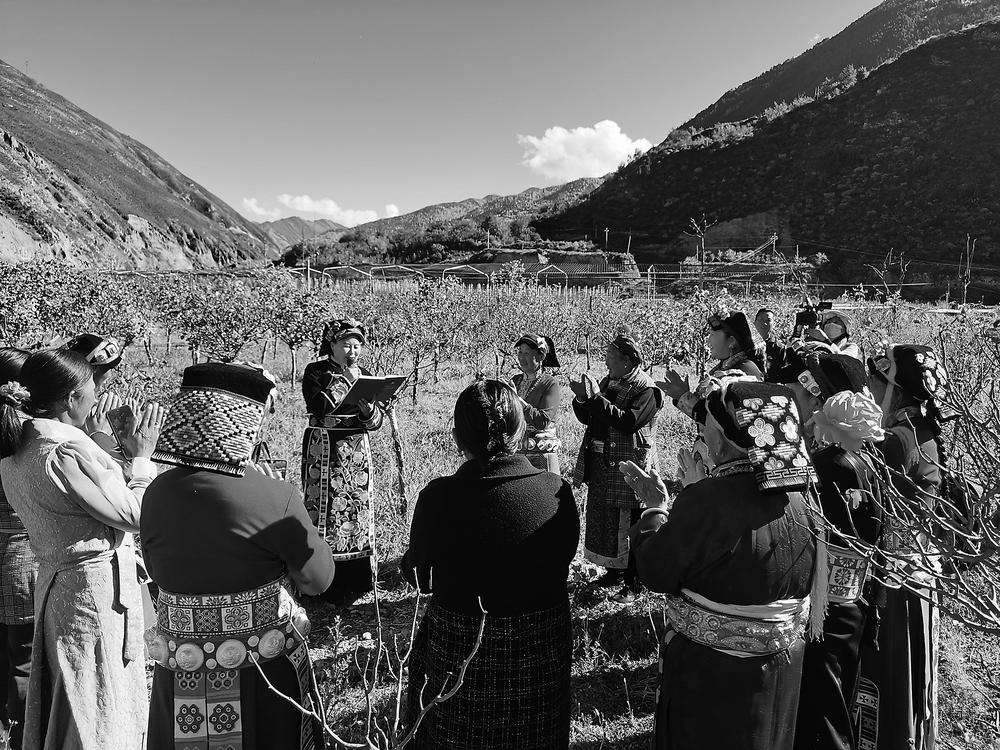 陳望慧(圖中)在勞動間隙向藏族群眾宣講黨的二十大精神。金宣 攝