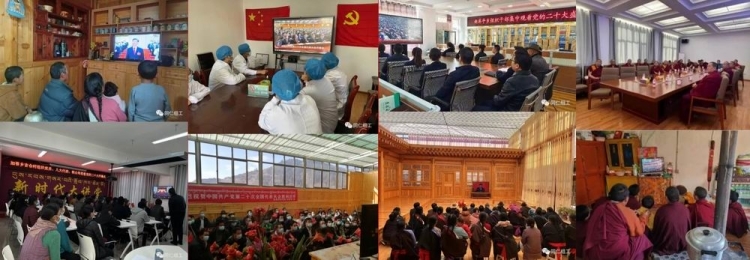 圖為青海省黃南州同仁市各地干部群眾一起收看黨的二十大開幕式,學習黨的二十大精神 圖片來源:同仁組工微信公眾號圖片拼合
