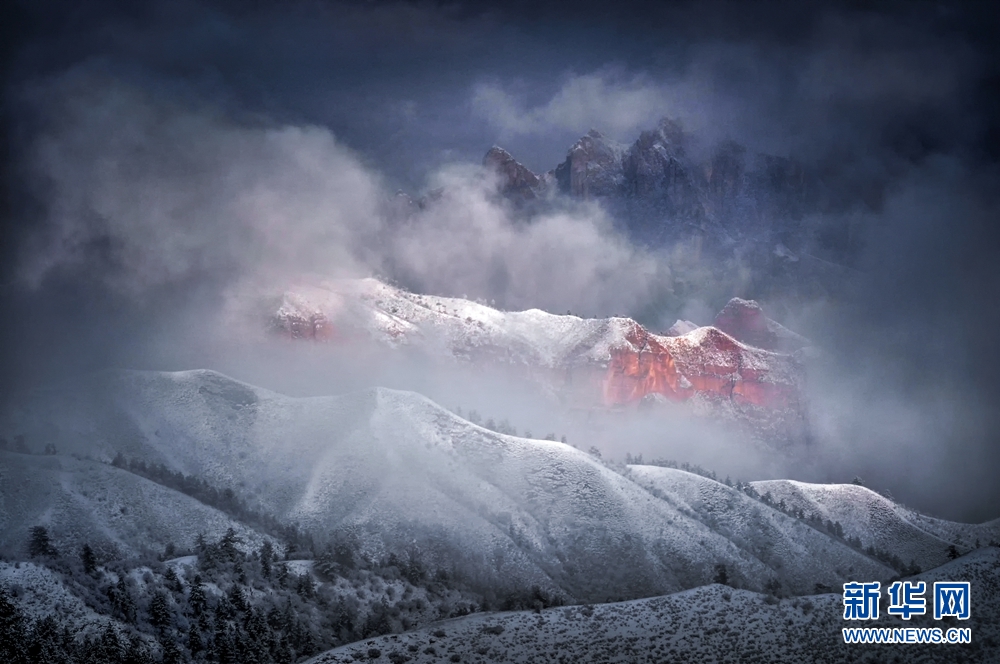 赤紅色的丹霞地貌與皚皚白雪相映成景,美不勝收。新華網(wǎng) 李河清 攝