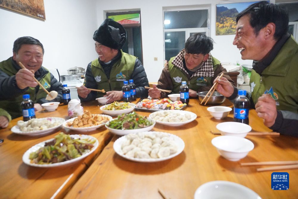 1月14日晚,管護(hù)員們在一起吃餃子。新華社記者 周盛盛 攝