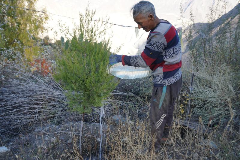 1950年出生在茂頂村木達水村民小組的丁爭,小時候多次看到雨季村里洪水成災(zāi),泥石流橫行,山體滑坡的場景。那時經(jīng)濟落后,村民日子過得苦。丁爭隨母親去頭人家放牛,由于天氣炎熱,饑渴難耐,母親就摘一個頭人家蘋果充饑,被頭人關(guān)了3天3夜。1957年,迪慶發(fā)展迎來新曙光,丁爭家分到了田、牲畜、果樹,當(dāng)家做主人,從此過上了新生活。2007年,丁爭兒孫滿堂,家務(wù)事不用操心,他就想植樹造林、保護生態(tài),防止山洪暴發(fā)和水土流失,造福子孫后代。于是,他拿著家里的鎬、盆,踏上植樹造林的漫漫長路。 在植樹造林的初期,丁爭老人靠自家的舊桶舊盆給樹苗澆水。隨著旭龍電站、忠態(tài)水庫等項目進場施工,丁爭老人就撿拾一些舊水管、舊鐵絲,把水引到離幼苗最近的地方,以便澆水。用廢棄的鐵絲把樹苗固定好,以免風(fēng)吹雨打樹苗飄搖致根系斷裂,影響生長。起初由于管理經(jīng)驗不足,澆水困難,1年種100棵樹苗,成活僅幾棵,但他沒有退縮,沒有喪失信心,查找成活率不高的原因,采取相應(yīng)的改進措施,逐年提高了樹苗成活率。