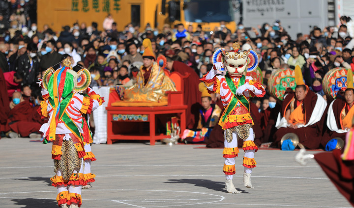 在甘肅拉卜楞寺,頭戴面具的僧人進行法舞表演。新華社記者 張智敏 攝