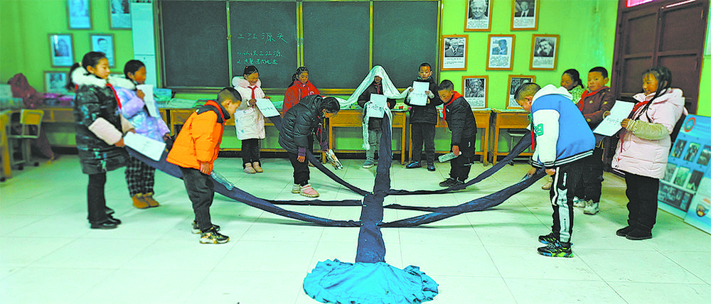 “你們手中的白布代表著長江源頭,藍色的布塊代表長江的其余支流,最末端這個圓形布塊代表著汪洋大海。”鬧布智美一邊分發(fā)游戲道具一邊解釋著游戲規(guī)則,同學們拿到各自的道具很快便進入“角色”,起初源頭和支流不受任何污染,干凈的水源源不斷地向下游奔流,后來有一個人在源頭扔了瓶子,慢慢地越來越多的人都開始往源頭和支流中扔垃圾,最終垃圾日積月累,讓下游再也沒有干凈的水,代表著大海圓形布塊也滿是從上游流下的垃圾。