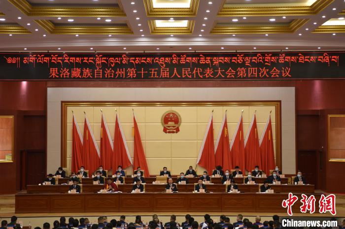 圖為果洛藏族自治州第十五屆人民代表大會第四次會議召開?!「谋!z