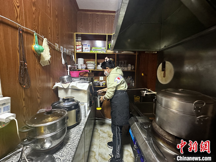 資料圖為長(zhǎng)江源村的一家藏餐吧內(nèi),店主李新財(cái)?shù)钠拮釉诿β怠?中新社記者 李雋 攝