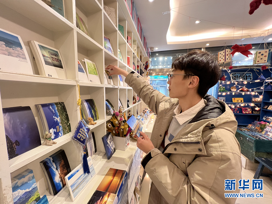 藍色的青海湖、金色的油菜花海、宛若明鏡的茶卡鹽湖……在青海省西寧市城中區(qū)莫家街一家文創(chuàng)小店里,來自山東青島的游客張開心正在店里挑選明信片。