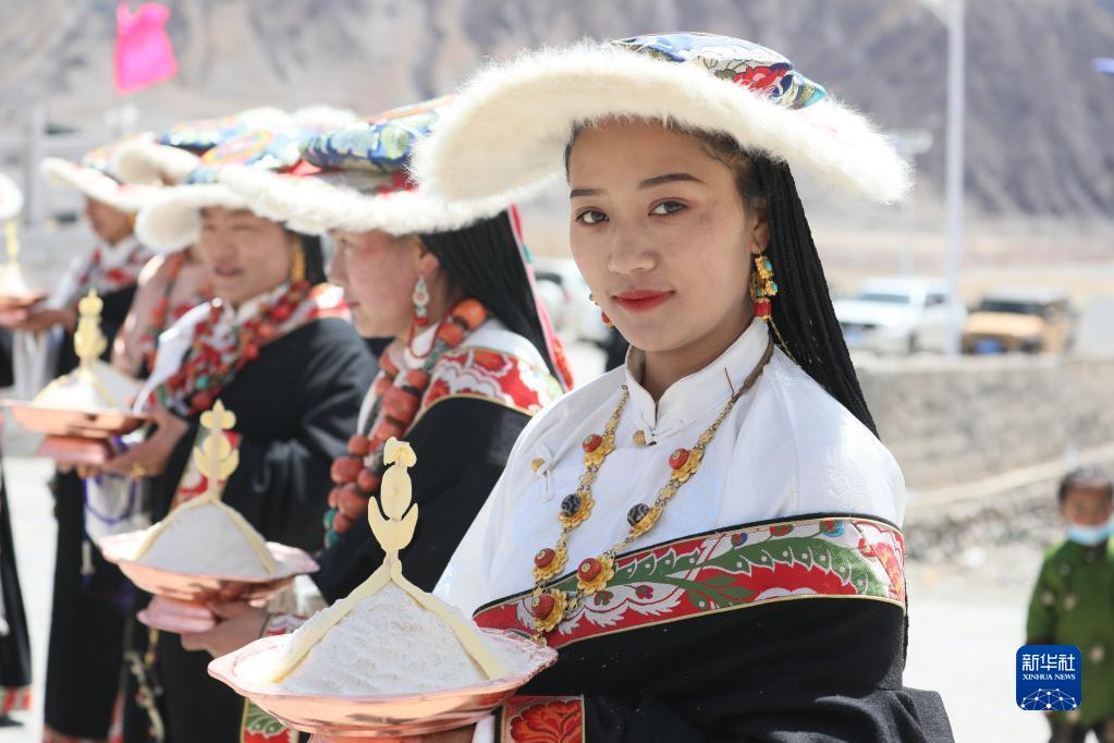 4月12日,在青海省玉樹藏族自治州稱多縣尕朵鄉(xiāng)卓木齊村舉辦的糌粑節(jié)上,當?shù)厝罕娬谡故厩囡?。新華社記者 王艷 攝