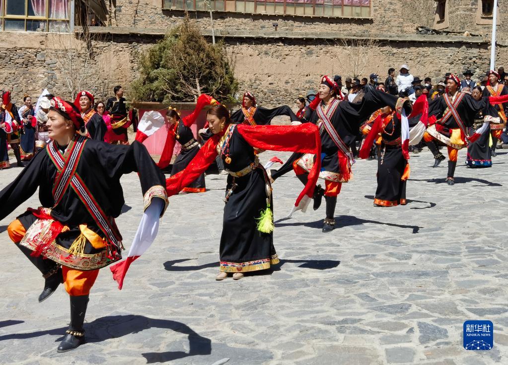 4月12日,在青海省玉樹藏族自治州稱多縣尕朵鄉(xiāng)卓木齊村舉辦的糌粑節(jié)上,群眾正在表演藏族舞蹈。新華社記者 柳澤興 攝