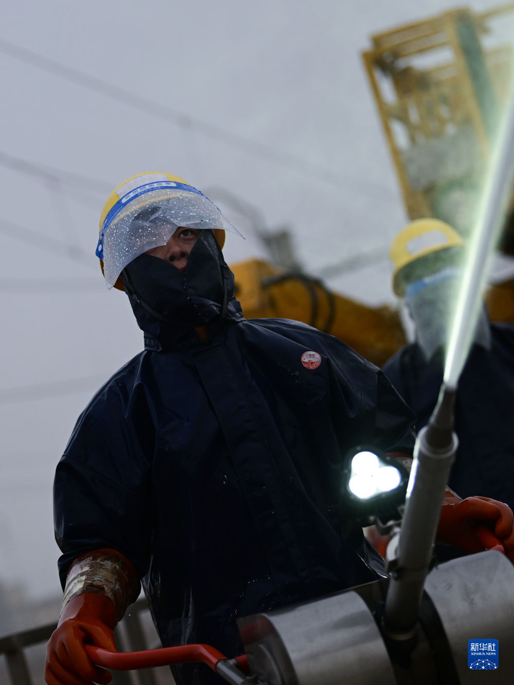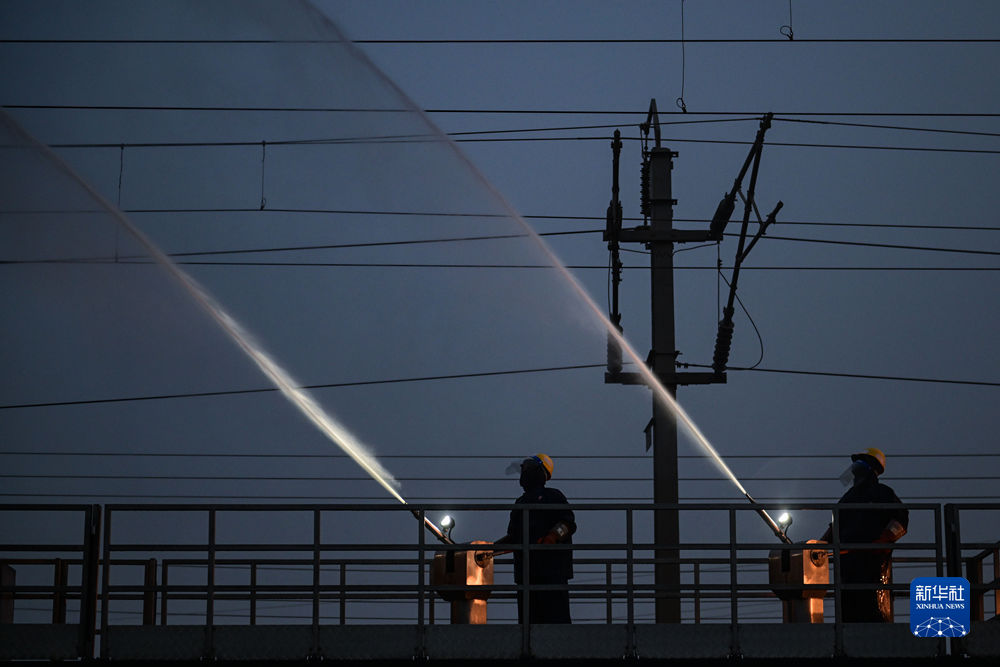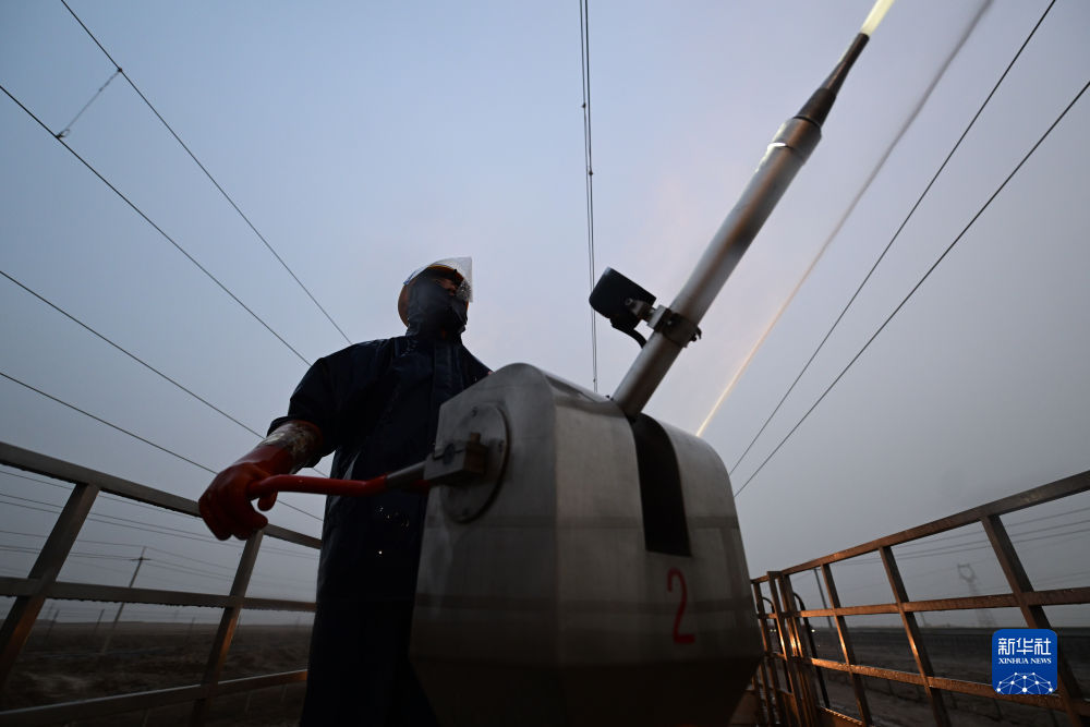 4月20日,中國(guó)鐵路青藏集團(tuán)有限公司西寧供電段格爾木大修車間大修網(wǎng)工區(qū)檢修工使用高壓沖洗水槍對(duì)絕緣子設(shè)備進(jìn)行清洗。新華社記者 張龍 攝