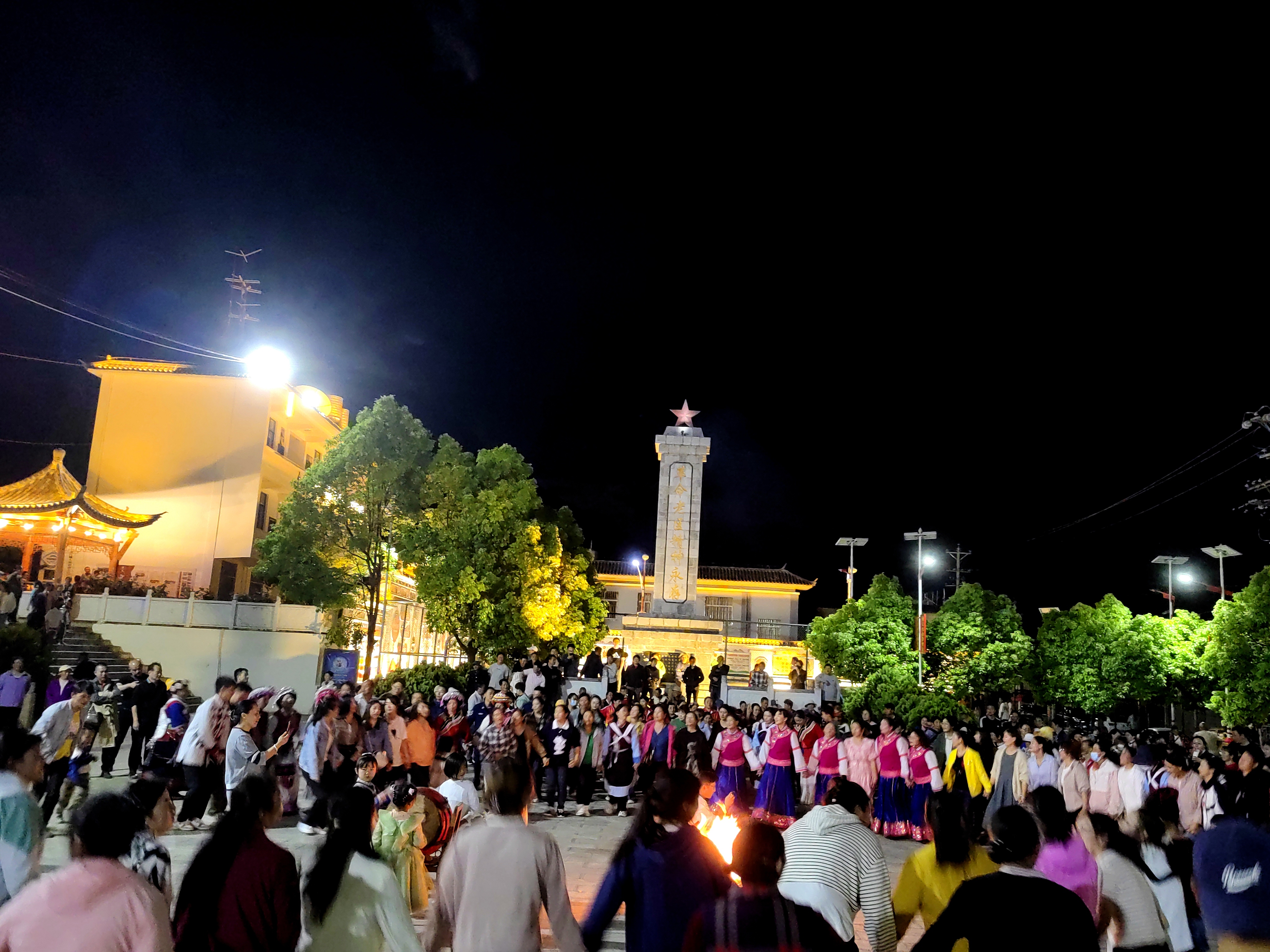 打跳開始了,不斷有圍觀群眾參與到打跳當中,打跳選手手牽手把篝火圍了三四圈,篝火的映照下,大家臉上的笑容又燦爛了幾分。打跳歌曲從勁爆葫蘆絲換到納西三部曲又換到大蠻調(diào),換了無數(shù)首,而參與群眾仿佛不知疲倦一直激情打跳著,現(xiàn)場非?;馃?。