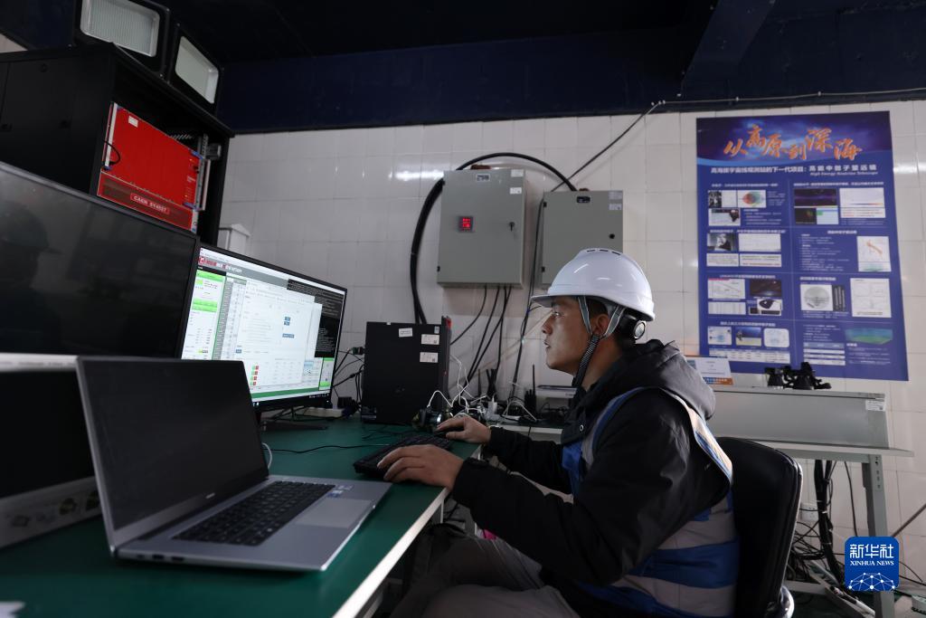 4月22日,工作人員在高海拔宇宙線觀測站觀測基地水切倫科夫探測器陣列處理實(shí)驗(yàn)數(shù)據(jù)。新華社記者 金立旺 攝