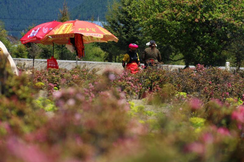 夏天,位于香格里拉市小中甸鎮(zhèn)的杜鵑花海競相綻放,紫色、粉色的花朵開成了海,與藍天白云遙相呼應,藏房點綴其間,美不勝收。每當花季,當?shù)氐睦习傩赵诨ê_厰[起特色美食,牦牛酸奶、苦蕎粑粑、酥油茶等美食供游客享用,坐在花海邊,品嘗當?shù)靥厣朗?,是這個夏天小中甸花海獨有的浪漫。