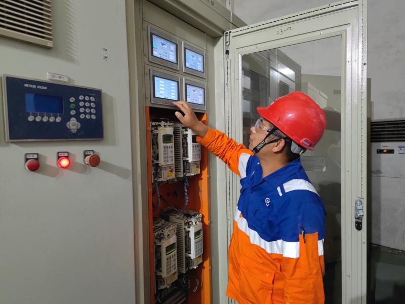 電修班組成員正在檢修設(shè)備。