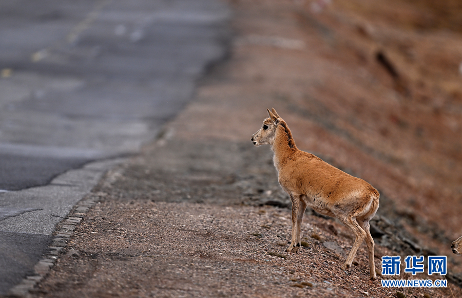 在青??煽晌骼铮恢淮菩源a(chǎn)藏羚羊準備通過青藏公路。新華網(wǎng) 潘彬彬 攝