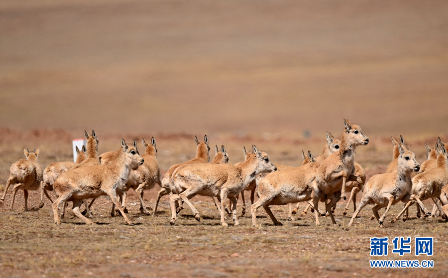 一群雌性待產(chǎn)藏羚羊在青海省玉樹藏族自治州境內(nèi)活動。新華網(wǎng) 潘彬彬 攝