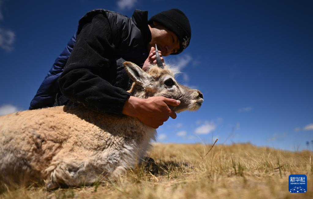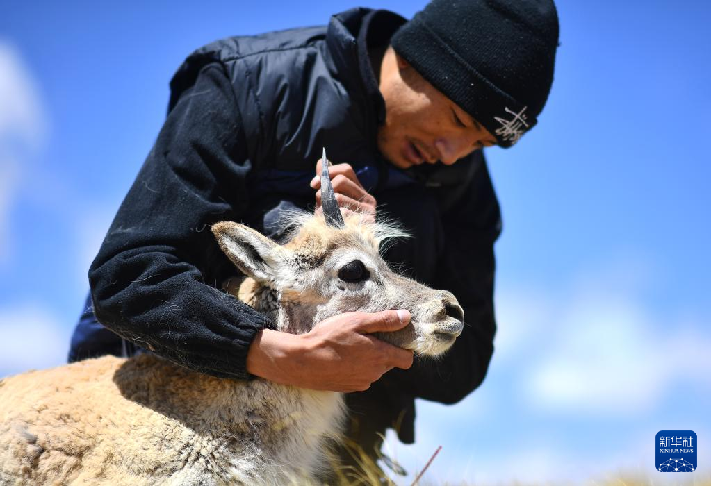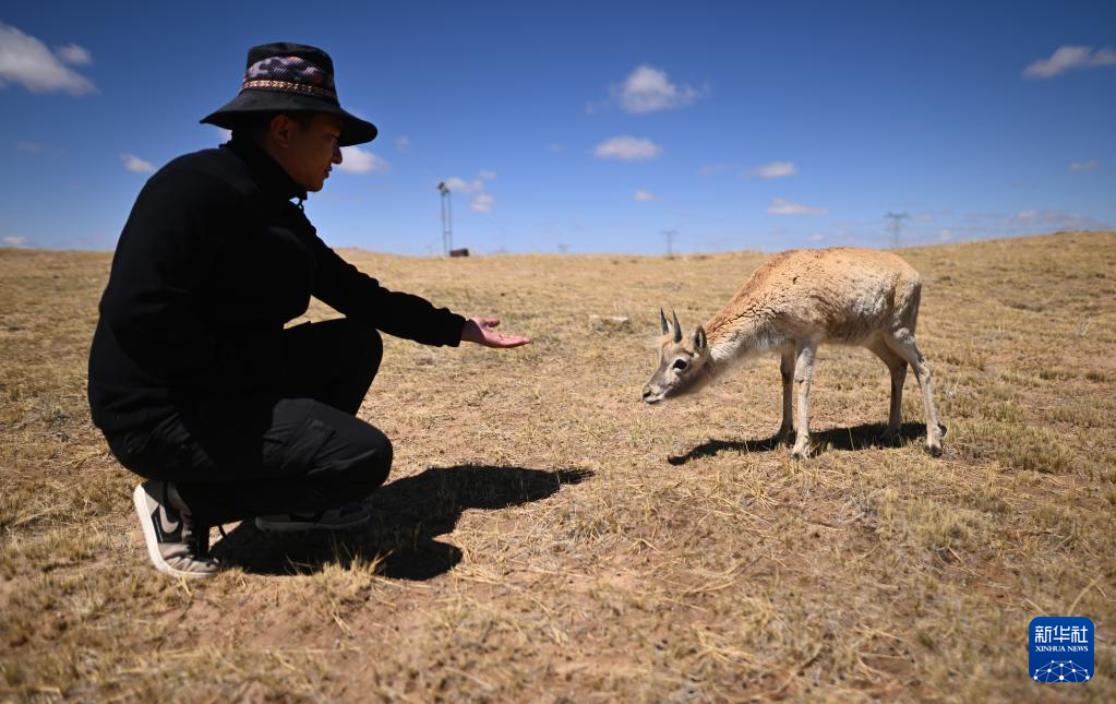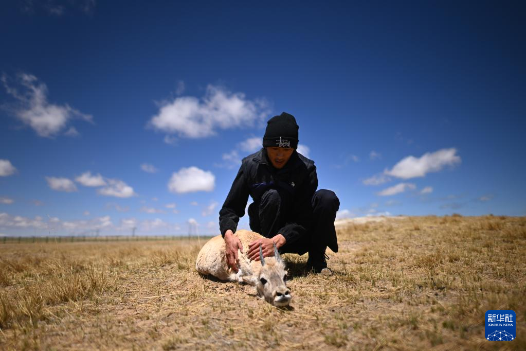 在可可西里國(guó)家級(jí)自然保護(hù)區(qū)索南達(dá)杰保護(hù)站,巡山隊(duì)員扎西桑周在野生動(dòng)物救助中心內(nèi)與一只被救助的小藏羚羊互動(dòng)(5月30日攝)?!⌒氯A社記者 張宏祥 攝