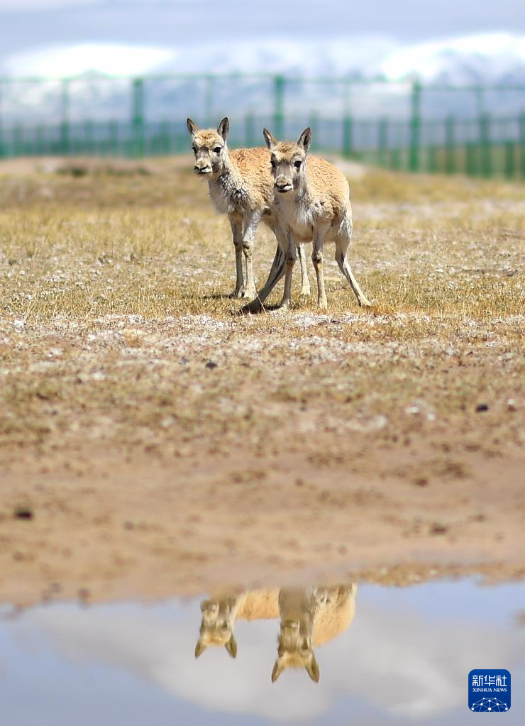 在可可西里國(guó)家級(jí)自然保護(hù)區(qū)索南達(dá)杰保護(hù)站,兩只藏羚羊在野生動(dòng)物救助中心活動(dòng)(5月30日攝)?!⌒氯A社記者 薛玉斌 攝