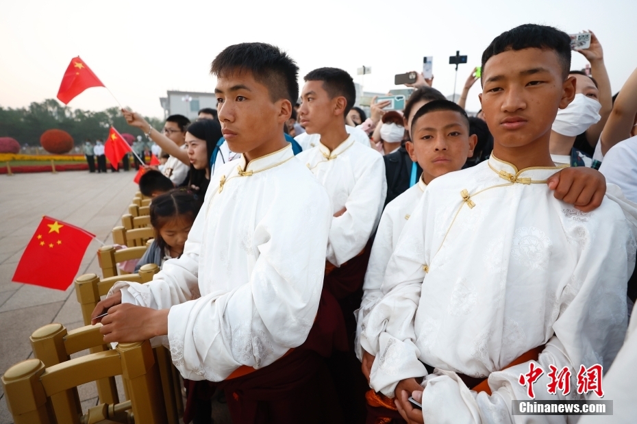 圖為觀看升旗儀式的藏族青少年們。中新社記者 富田 攝