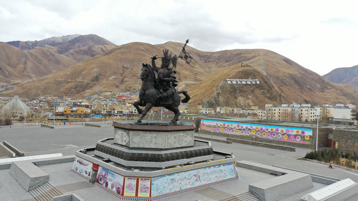 這是青海省玉樹(shù)藏族自治州玉樹(shù)市格薩爾王廣場(chǎng)(無(wú)人機(jī)照片)。新華社記者 張宏祥 攝