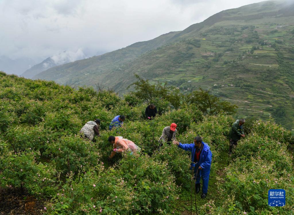 6月14日,在四川省阿壩州小金縣新橋鄉(xiāng)共和村,當?shù)胤N植戶在采摘玫瑰鮮花。新華社記者 王曦 攝