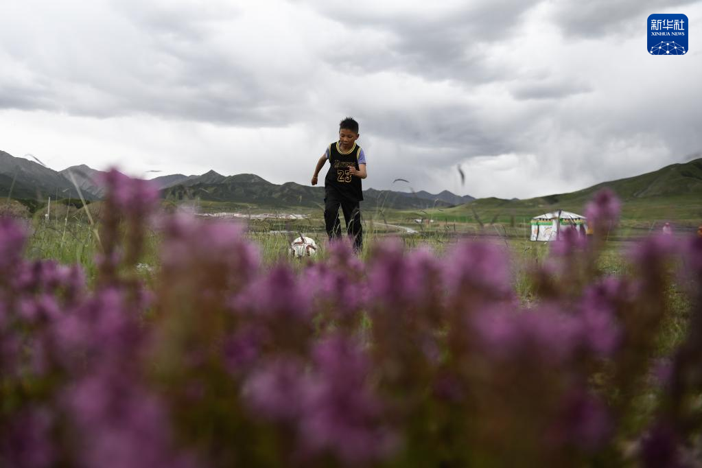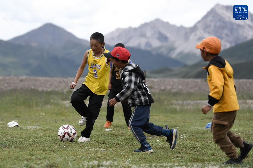 果洛州藏族兒童在草地上踢球。新華社記者 張龍 攝