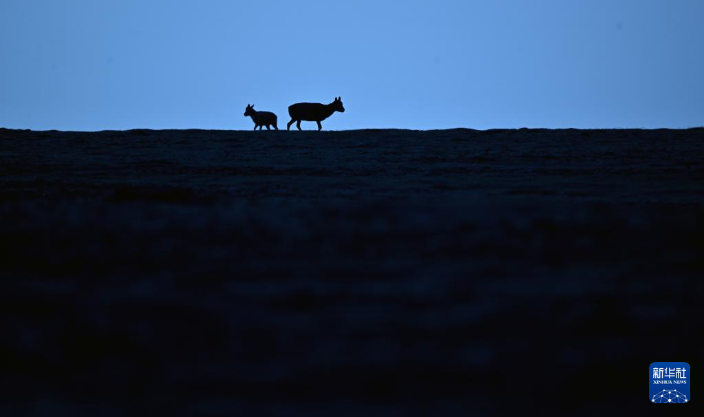 兩只藏羚羊在可可西里卓乃湖區(qū)域活動(6月17日攝)。新華社記者 張宏祥 攝