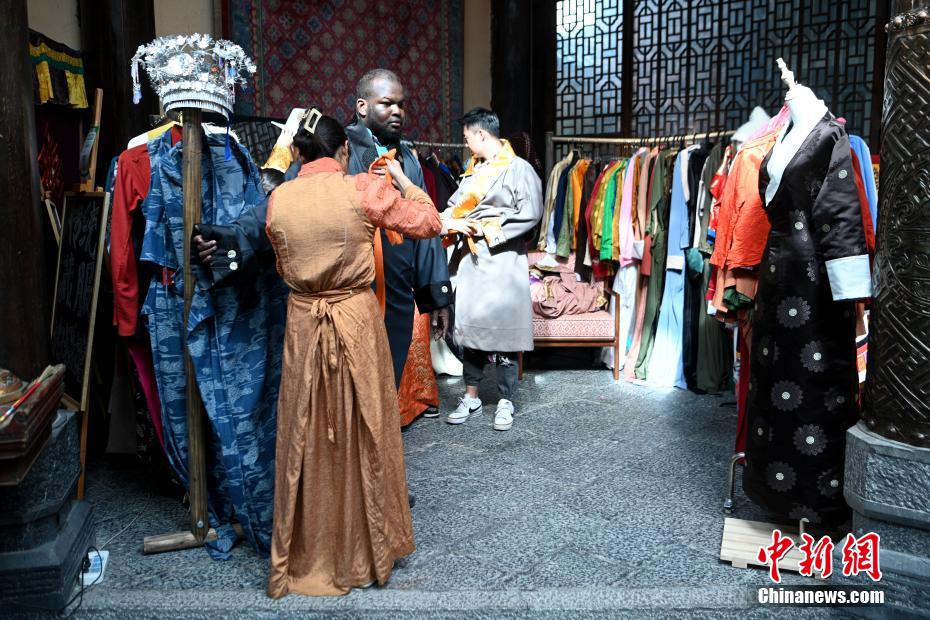 圖為工作人員幫助“Z世代”青年試穿藏族服飾。李嘉嫻 攝