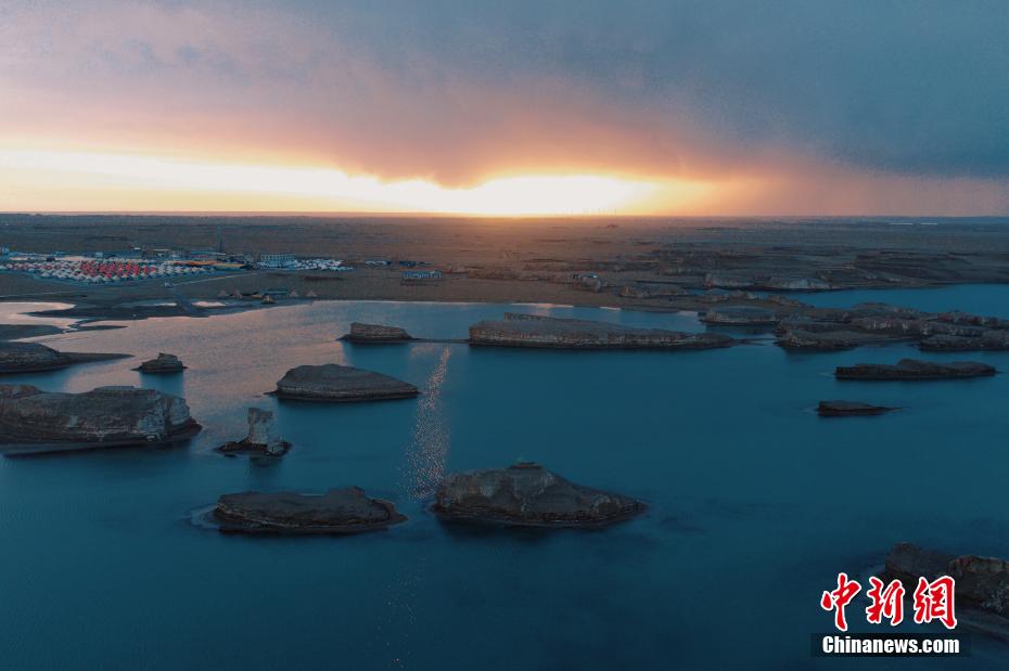 6月24日,清晨的降雨過后,青海省海西蒙古族藏族自治州大柴旦烏素特(水上)雅丹天空澄碧,纖云不染,太陽(yáng)緩緩上升,給天邊鑲嵌了一條金邊,與烏素特(水上)雅丹遙相輝映,風(fēng)光旖旎。